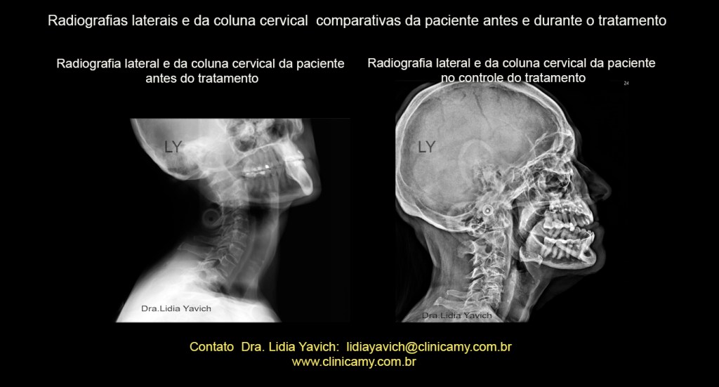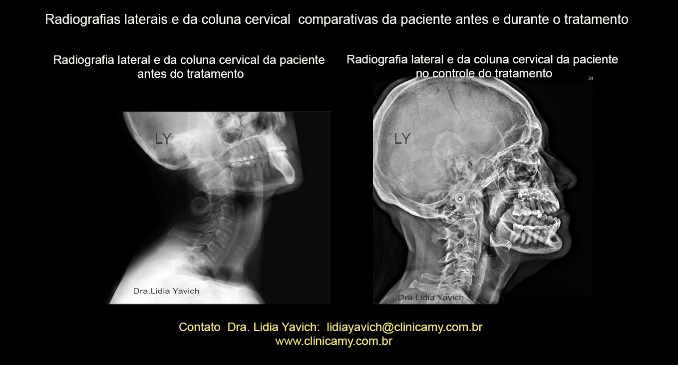 Radiografias laterais e da coluna cervical comparativas da paciente, antes em oclusão habitual e durante o tratamento com o dispositivo instalado.